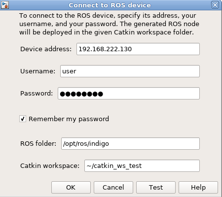 Сконфигурируйте связь со своим внешним устройством ROS. Под вкладкой Robot нажмите Connect to Robot, чтобы открыть Подключение к диалоговому окну устройства ROS. В этом диалоговом окне можно ввести всю информацию, что Simulink должен развернуть узел ROS. Это включает IP-адрес или имя хоста вашего устройства ROS, ваших учетных данных входа в систему и рабочей области Сережки. Измените рабочую область Сережки в ~/catkin_ws_test.
