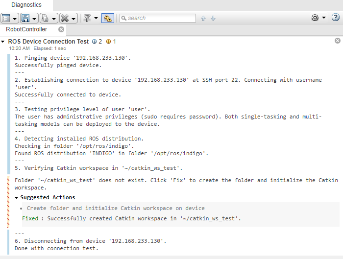 Если устройство ROS включено и доступно от вашего компьютера, можно проверить настройки подключения путем нажатия на Test. Тест проверяет каждую настройку устройства, и выведите предупреждения и ошибки в Средстве просмотра Диагностики Simulink, если проблемы найдены. Если возможно, тест также предлагает, как проблемы могут быть решены. Нажмите Test теперь.