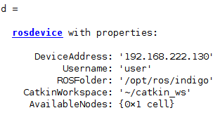 В MATLAB можно использовать rosdevice возразите, чтобы запустить ведущее устройство ROS на устройстве ROS. Если вы не обеспечиваете аргументов, rosdevice использует настройки подключения устройства, которые вы ввели в диалоговое окно Simulink, чтобы связать с устройством ROS.