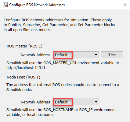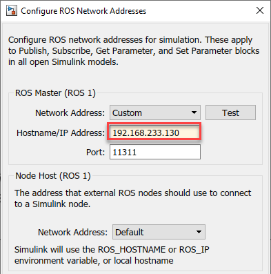 Задайте настройки сети ROS в Simulink: По умолчанию Simulink использует настройки подключения ROS от rosinit в MATLAB. Чтобы заменить эти настройки, задайте настройки подключения ROS в Simulink. Под вкладкой Simulation выберите ROS Toolbox> ROS Network и установите адреса сети ROS Master и Node Host:
