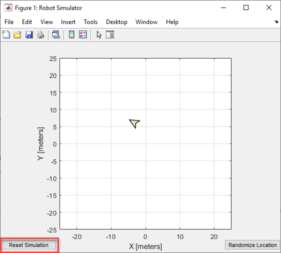 6. Нажмите кнопку Reset Simulation в окне симуляции. Робот остается в местоположении [0,0] и не перемещается.