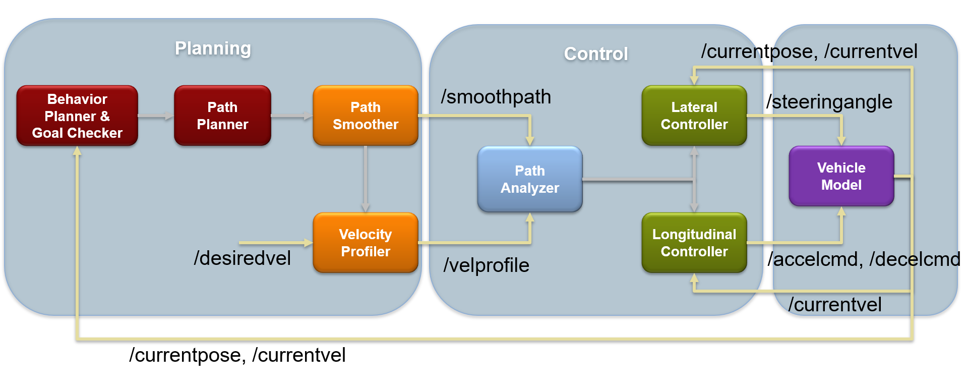Это приложение демонстрирует типичное разделение различных функций в узлы ROS. Следующее изображение показывает, как вышеупомянутый пример разделен в различные узлы. Каждый узел: Планирование, Управление и Транспортное средство являются узлом ROS, реализующим функциональности, показанные как ниже. Соединения между узлами показывают темы, используемые на каждом соединении узлов.