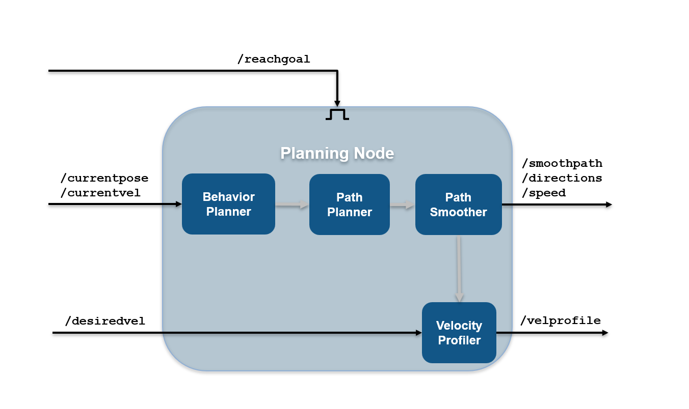 Узел Планирования вычисляет каждый сегмент пути на основе текущего положения транспортного средства. Этот узел ответственен за генерацию сглаженного пути и публикует путь к сети.