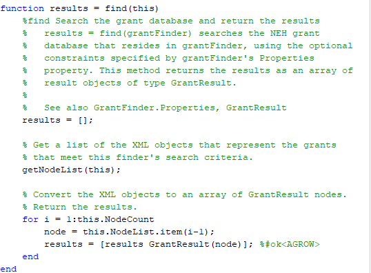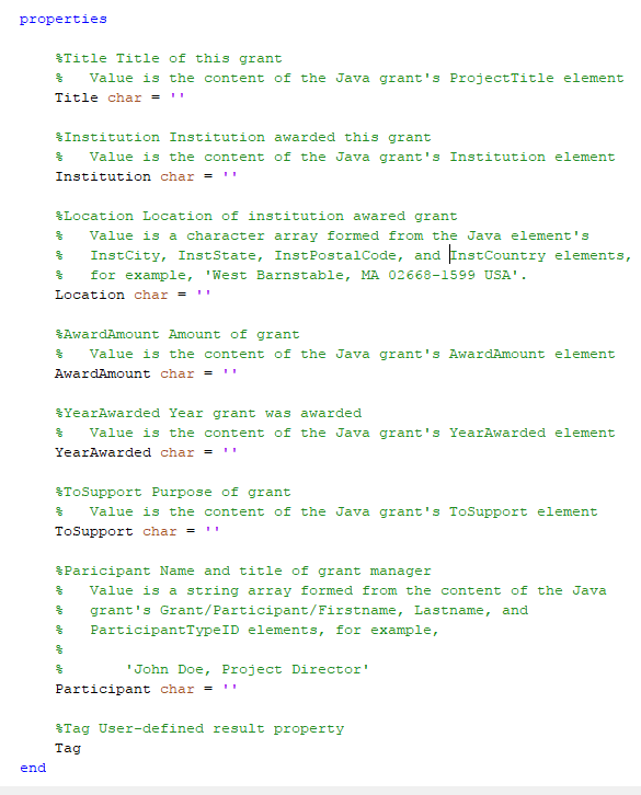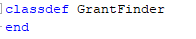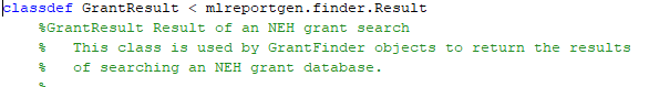Создание средства поиска влечет за собой создание класса MATLAB, который задает свойства и поведение средства поиска. Следующие разделы объясняют, что шаги должны были создать класс средства поиска. Объяснение использует класс под названием GrantFinder as an example. Код для класса находится в файле, GrantFinder.m, это сопровождает этот скрипт. GrantFinder класс задает средство поиска, способное к нахождению и форматированию грантов, предоставленных американским Национальным фондом гуманитарных наук (NEH).