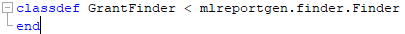 mlreportgen.finder.Finder класс задает другие свойства и методы, которые должно задать ваше определение класса средства поиска. Это гарантирует, что ваше средство поиска работает с API Отчета.