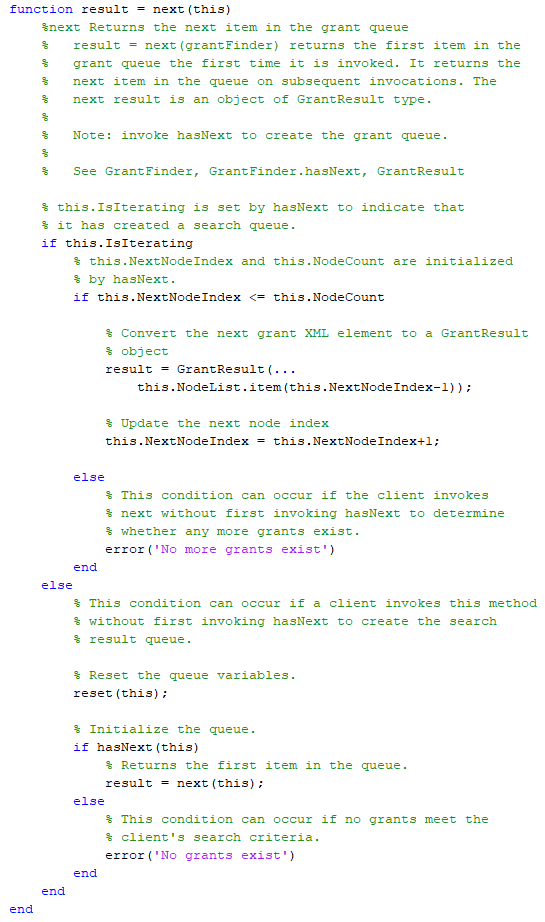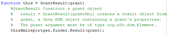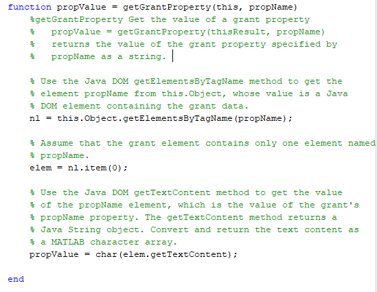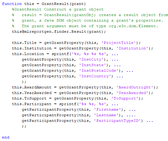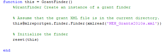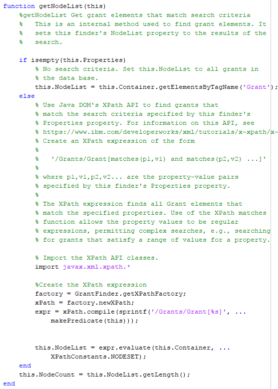 GrantFinder конструктор использует xmlread MATLAB функционируйте, чтобы считать XML-файл предоставления из диска и преобразовать его в Java документ DOM. Это затем передает документ DOM mlreportgen.finder.Finder конструктор, который устанавливает Java документ DOM как значение Container средства поиска свойство. При хранении базы данных NEH как Java документ DOM позволяет средству поиска использовать стороннее программное обеспечение Java, чтобы искать базу данных. См. Java Xerces API DOM для получения дополнительной информации.