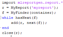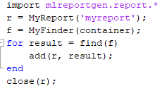 Задайте API отчета mlreportgen.finder.Finder класс как базовый класс для вашего средства поиска.