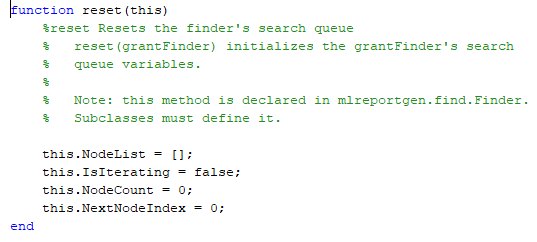 Конструктор также вызывает reset функция, которая инициализирует переменные, раньше искала базу данных предоставления. Класс GrantFinder задает эту функцию. Точно так же ваш класс должен задать функцию сброса. reset функция гарантирует, что клиент может использовать ваше средство поиска, чтобы провести несколько поисковых запросов его контейнера. Смотрите Задают Функцию Сброса для получения дополнительной информации.