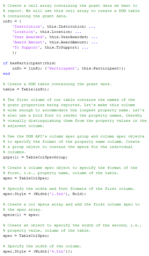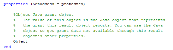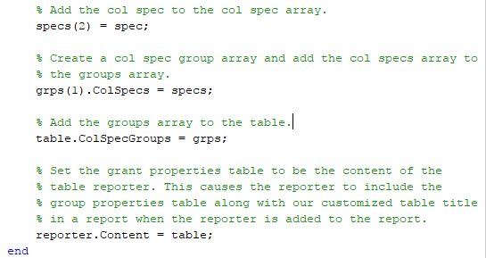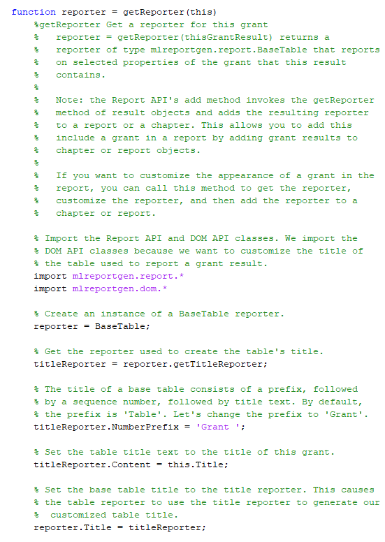GrantResult определение класса задает getReporter метод, который возвращает настроенную версию API Отчета mlreportgen.report.BaseTable генератор отчетов. BaseTable генератор отчетов генерирует таблицу с пронумерованным заголовком. GrantResult класс настраивает BaseTable генератор отчетов, чтобы сгенерировать таблицу свойств предоставления, например,