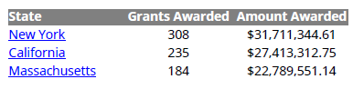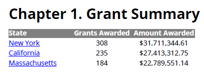 Создайте сводные данные предоставления как первую главу отчета. Глава сводных данных предоставления содержит заголовок и сводную таблицу предоставления. Каждая строка таблицы перечисляет общее количество предоставлений и общей суммы денег, присужденных учреждениям в состоянии в течение лет 2010-2012. Состояния появляются в таблице в порядке убывания количества предоставлений. Каждое состояние связывается гиперссылками к главе, которая детализирует гранты, предоставленные ему.