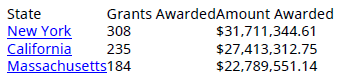 NGrants: количество предоставлений, сделанных к учреждениям в этом состоянии (первоначально пустой)