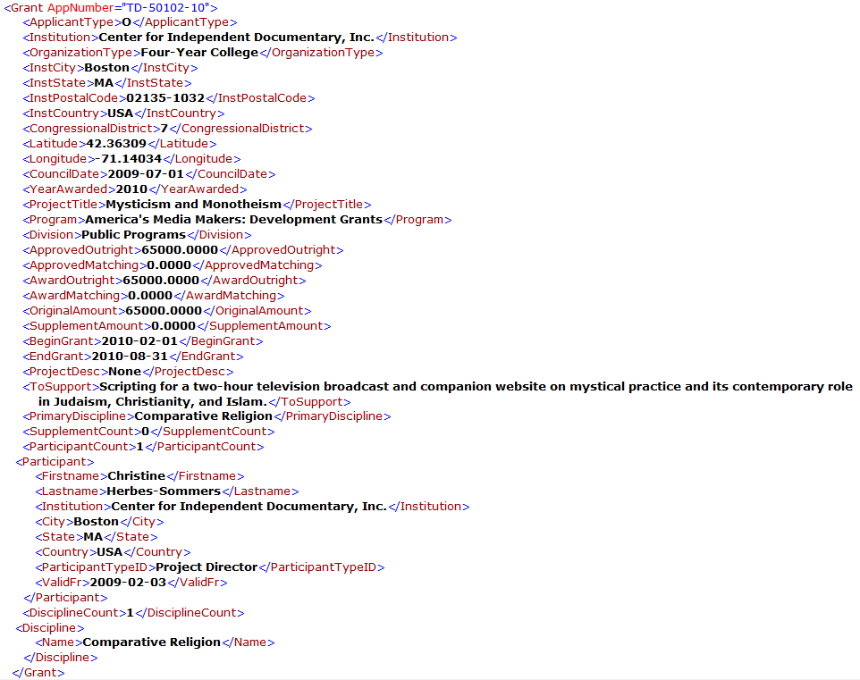 База данных состоит из Grants элемент, который содержит набор Grant элементы, каждый из которых содержит набор элементов данных предоставления. Следующее является извлечением из базы данных, которая иллюстрирует ее структуру: