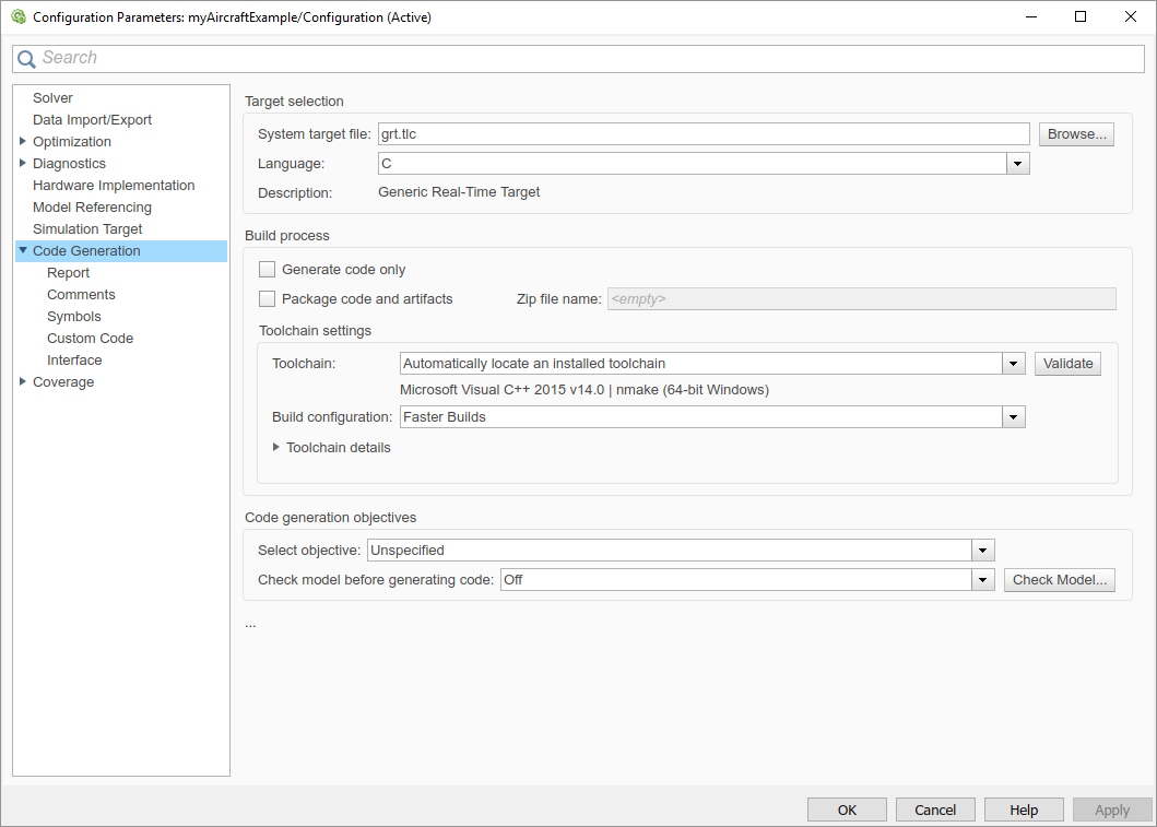 В Code Generation> Report, установите флажок Create code generation report. Это действие позволяет программному обеспечению создать и отобразить отчет генерации кода для myAircraftExample модель.
