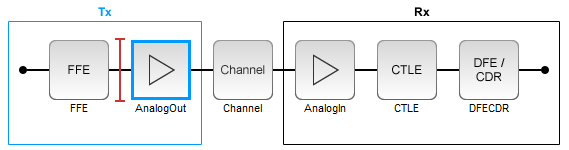 Модель Tx AnalogOut настраивается так, чтобы Напряжением был 1.05 V, Временем нарастания является 12 PS, R (выходное сопротивление) является 50 Омами и C (емкость) является 0.25 pF согласно спецификации PCIe4.