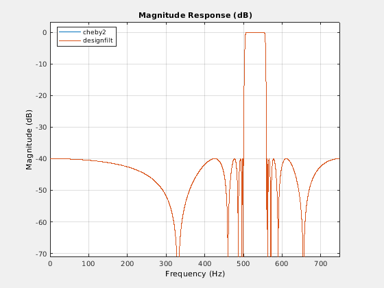 [ проектирует lowpass, highpass, полосу пропускания или bandstop Чебышевский фильтр Типа II, в зависимости от значения b,a] = cheby2(n,Rs,Ws,ftype)ftype и число элементов Ws. Получившаяся полоса пропускания и проекты bandstop имеют порядок 2n.