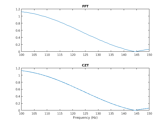С этими значениями по умолчанию, czt возвращает Z-преобразование x в m равномерно распределенные точки вокруг модульного круга. Это эквивалентно дискретному преобразованию Фурье x, или fft(x)Пустая матрица задает значение по умолчанию для параметра.