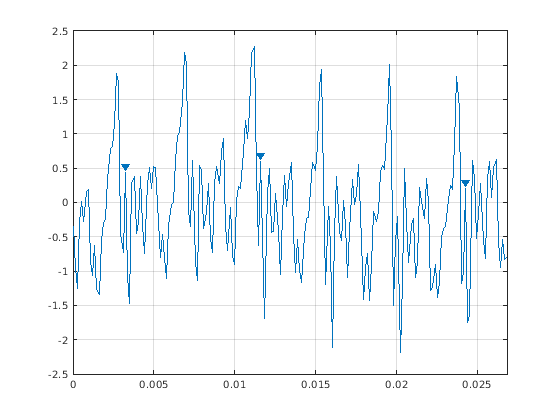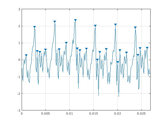 [pk,lc] = findpeaks(s,t); hold on plot(lc,pk,'x')