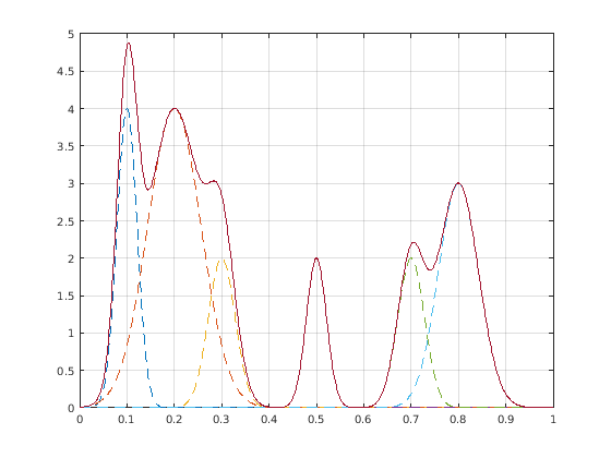x = linspace(0,1,1000); Pos = [1 2 3 5 7 8]/10; Hgt = [3 4 4 2 2 3]; Wdt = [2 6 3 3 4 6]/100; for n = 1:length(Pos) Gauss(n,:) = Hgt(n)*exp(-((x - Pos(n))/Wdt(n)).^2); end PeakSig = sum(Gauss);