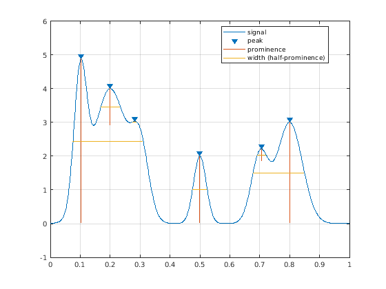 p — Пиковые выдающиеся положенияПиковые выдающиеся положения, возвращенные как вектор вещественных чисел. Выдающееся положение пика является минимальным вертикальным расстоянием, что сигнал должен убывать по обе стороны от пика прежде или поднимающийся назад на уровень выше, чем пик или достигающий конечной точки. Смотрите Выдающееся положение для получения дополнительной информации.