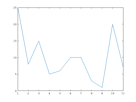 data = [25 8 15 5 6 10 10 3 1 20 7]; plot(data)