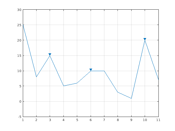 возвращает вектор с локальными максимумами (peaks) вектора входного сигнала, pks = findpeaks(data)data. Локальный пик является выборкой данных, которая или больше, чем ее две соседних выборки или равна Inf. Non-Inf конечные точки сигнала исключены. Если пик является плоским, функция возвращает только точку с самым низким индексом.