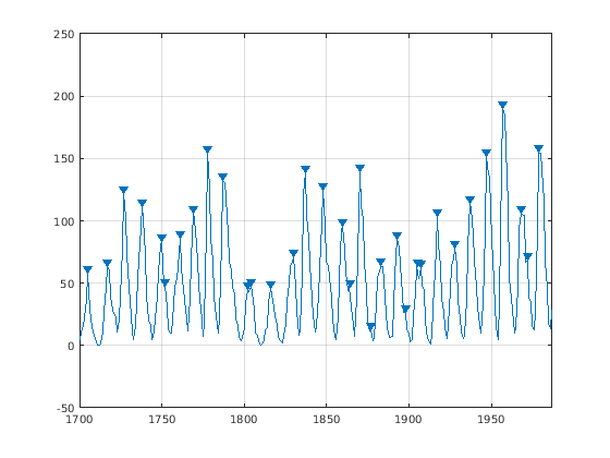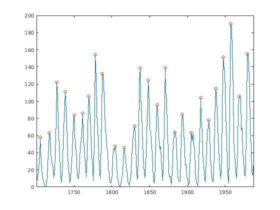 findpeaks(avSpots,year,'MinPeakDistance',6)