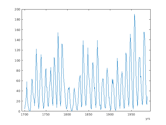 TT = timetable(years(year),avSpots); plot(TT.Time,TT.Variables)