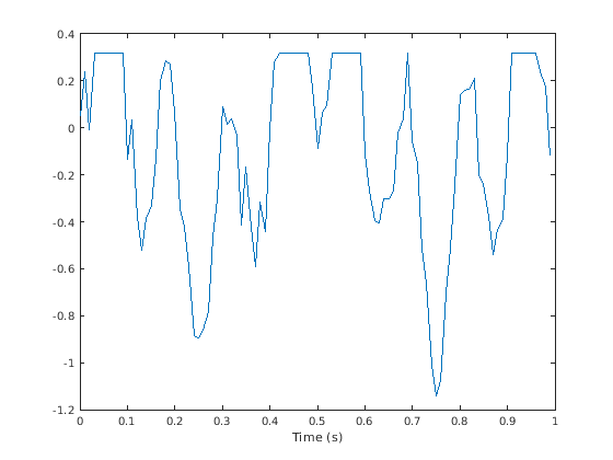 s = sin(2*pi*5*t).*sin(2*pi*3*t)+randn(size(t))/10;Симулируйте влажное измерение путем усечения каждого чтения, которое больше заданного, связанного 0,32. Постройте влажный сигнал.
