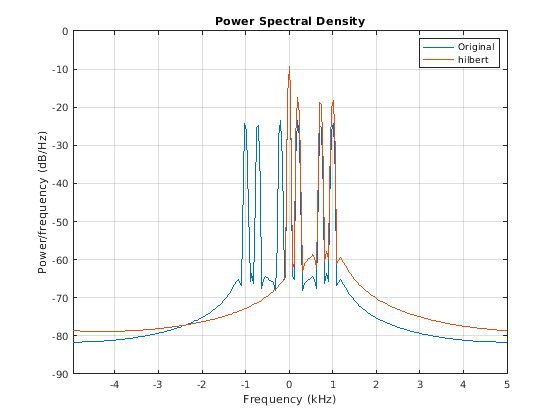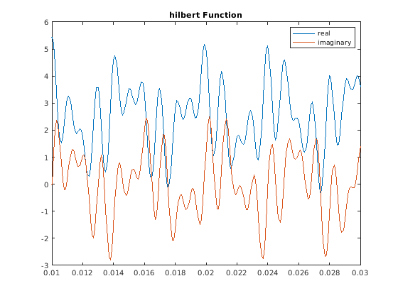 Аналитический сигнал для последовательности xr имеет одностороннее преобразование Фурье. Таким образом, преобразование исчезает для отрицательных частот. Аппроксимировать аналитический сигнал, hilbert вычисляет БПФ входной последовательности, заменяет те коэффициенты БПФ, которые соответствуют отрицательным частотам с нулями, и вычисляет обратный БПФ результата.