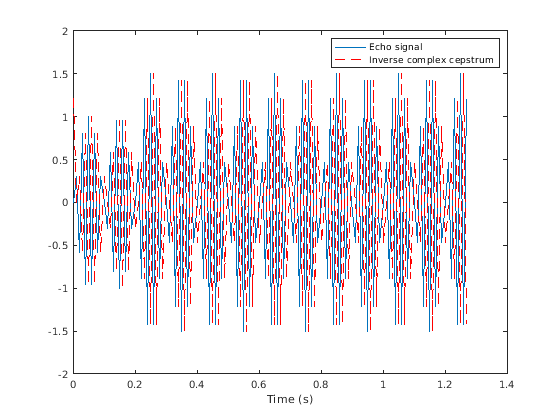 Сгенерируйте синус частоты 45 Гц, произведенных на уровне 100 Гц. Добавьте эхо с половиной амплитуды и 0.2 с спустя. Вычислите комплексный кепстр сигнала.