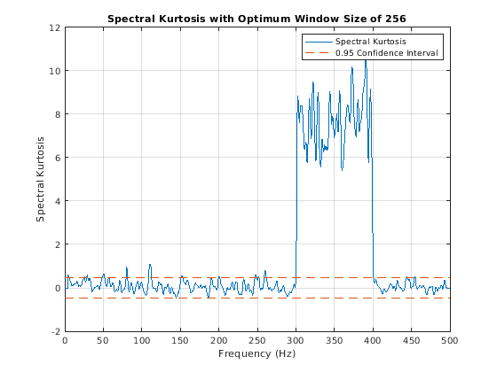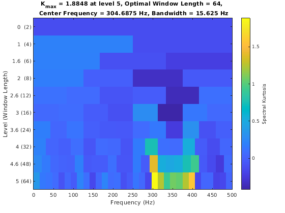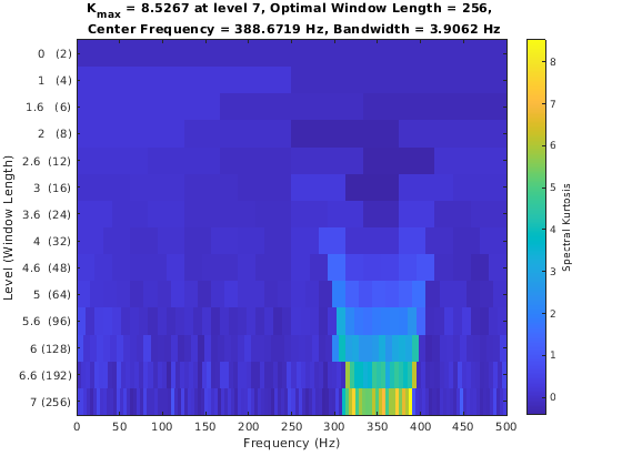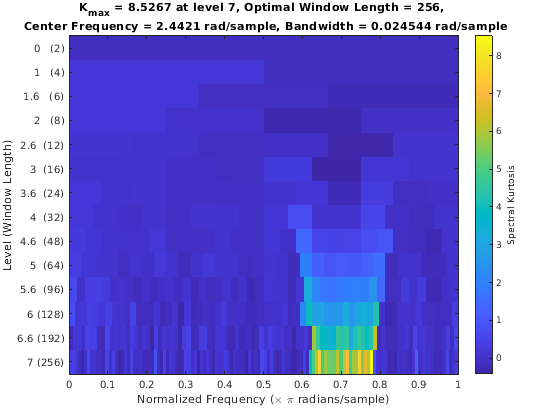 [ возвращает быстрый kurtogram наряду с набором параметров, которые можно использовать в последующем проекте полосового фильтра и спектральном эксцессе:kgram,f,w,fc,wc,bw] = kurtogram(___)