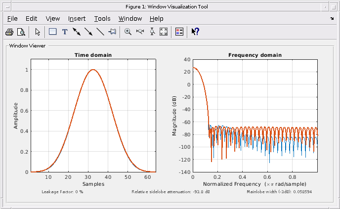 использование w = nuttallwin(N,SFLAG)SFLAG выборка окна. SFLAG может быть 'symmetric' или 'periodic'. Значением по умолчанию является 'symmetric'. Можно найти уравнения, задающие симметричные и периодические окна в Алгоритмах.