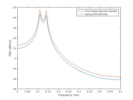 pburg(___) без выходных аргументов строит AR оценка PSD в дБ на модульную частоту в окне текущей фигуры.