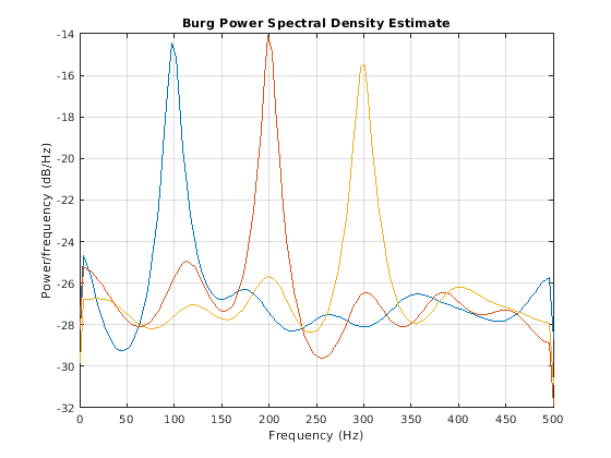 возвращает оценку степени спектральной плотности (PSD), pxx = pburg(x,order)pxx, из сигнала дискретного времени, x, найденное использование метода Бурга. Когда x вектор, он обработан как один канал. Когда x матрица, PSD вычисляется независимо для каждого столбца и хранится в соответствующем столбце pxx. pxx распределение степени на модульную частоту. Частота выражается в модулях рад/выборки. order порядок авторегрессивной модели (AR), используемой, чтобы произвести оценку PSD.