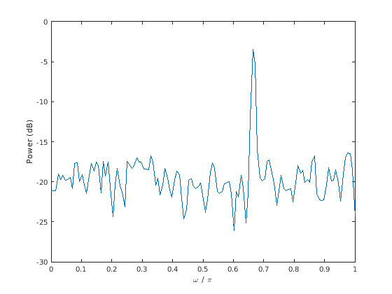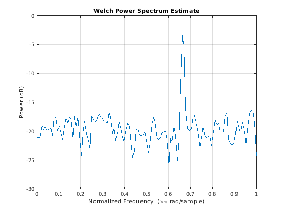 Сгенерируйте 1 024 выборки шумной синусоиды, имеющей нормированную частоту рад/выборка. Оцените спектр мощности сигнала с помощью pwelch. Выразите оценку в децибелах и постройте ее.