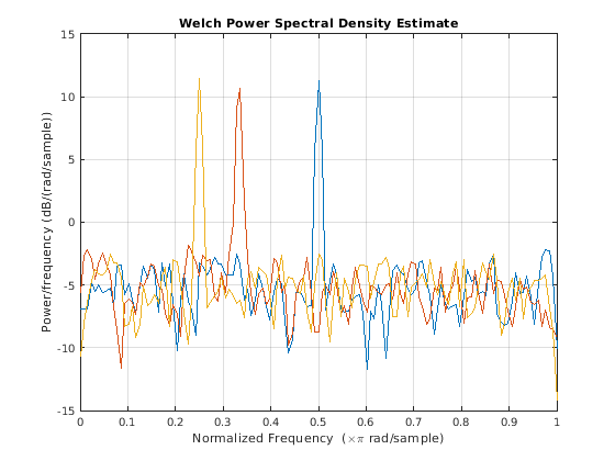 возвращает оценку степени спектральной плотности (PSD), pxx = pwelch(x)pxx, из входного сигнала, x, найденное использование перекрытого средства оценки усреднения сегмента валлийцев. Когда x вектор, он обработан как один канал. Когда x матрица, PSD вычисляется независимо для каждого столбца и хранится в соответствующем столбце pxx. Если x с действительным знаком, pxx односторонняя оценка PSD. Если x с комплексным знаком, pxx двухсторонняя оценка PSD. По умолчанию, x разделен на самые длинные сегменты, чтобы получить как близко к, но не превысить 8 сегментов с 50%-м перекрытием. Каждый сегмент является оконным с Окном Хэмминга. Модифицированные периодограммы усреднены, чтобы получить оценку PSD. Если вы не можете разделить длину x точно в целое число сегментов с 50%-м перекрытием, x является усеченным соответственно.