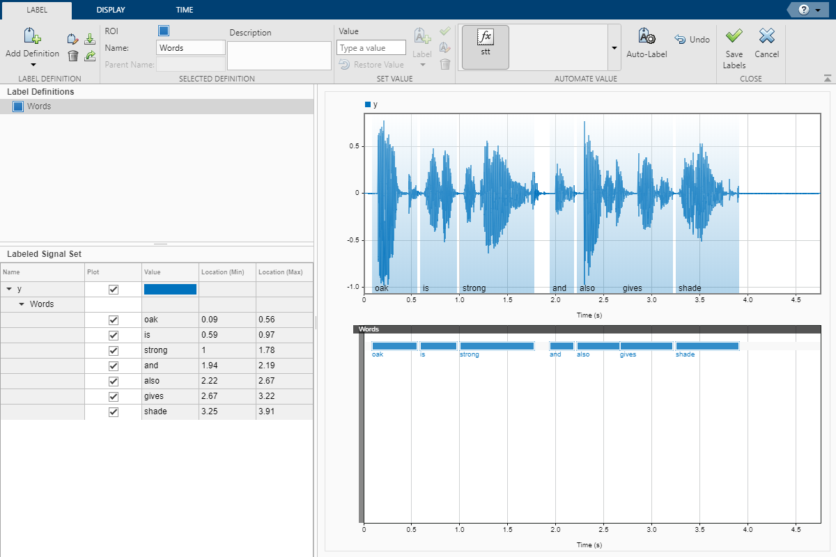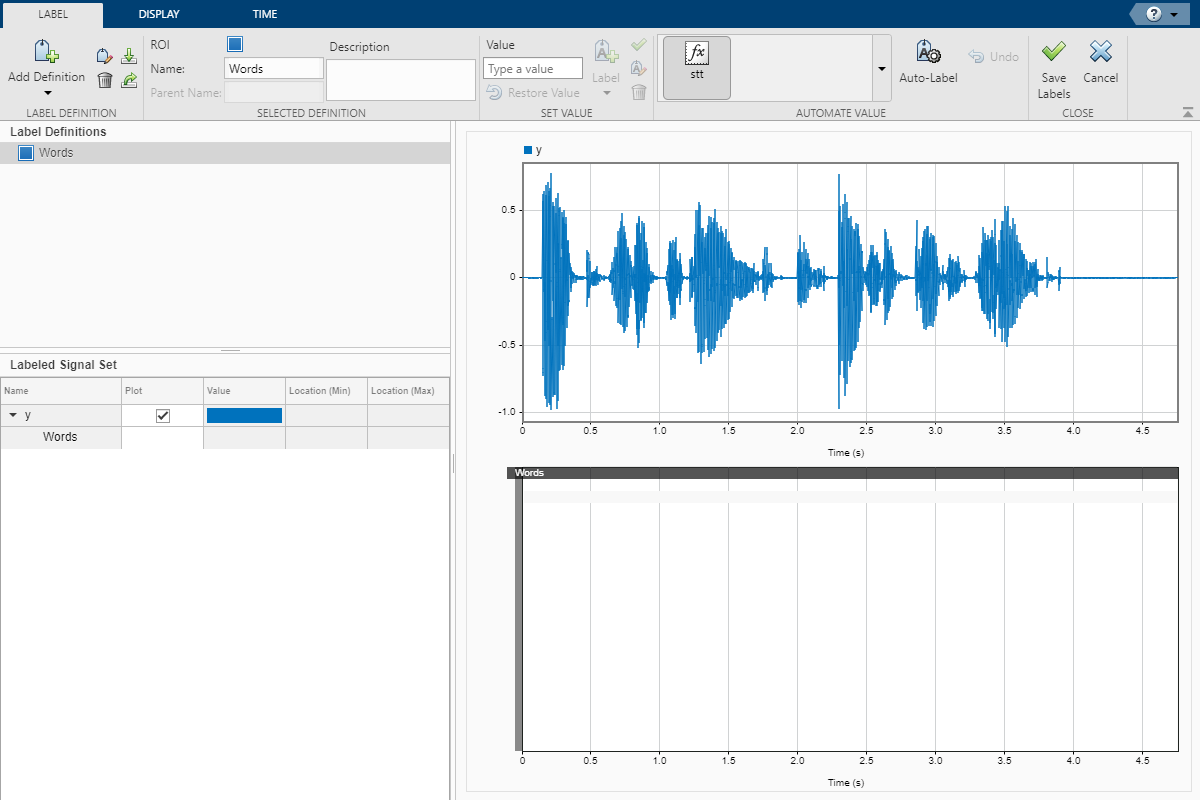 Задайте метку, чтобы присоединить к сигналу. Нажмите Add Definition на вкладке Label. Задайте Маркировать Name как Words, выберите Label Type of ROI, и введите Тип данных как string.