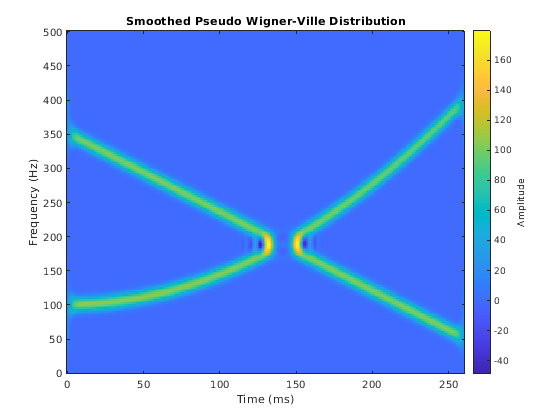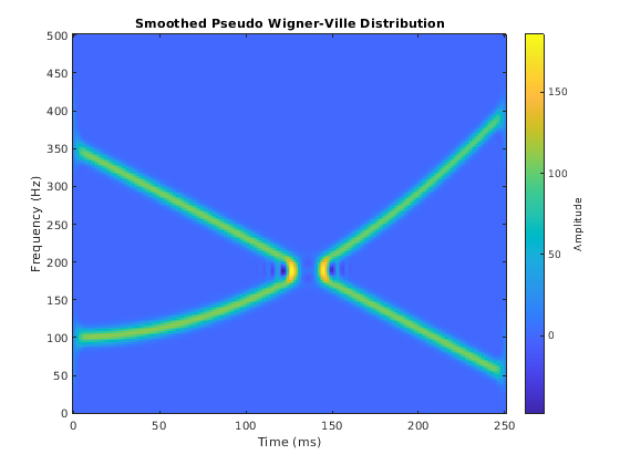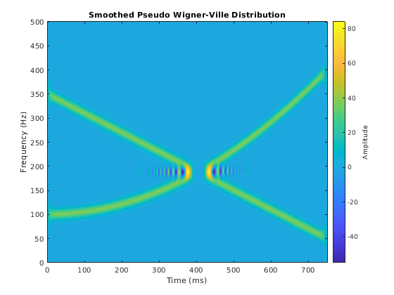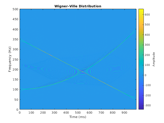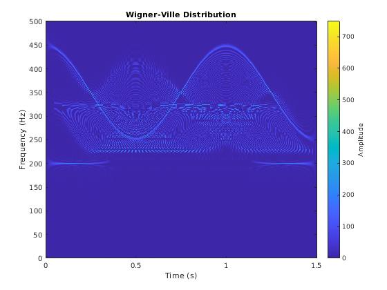 wvd(___) без выходных аргументов строит Wigner-Ville или сглаженное псевдо распределение Wigner-Ville в текущей фигуре.