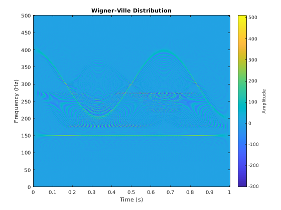 xwvd(___) без выходных аргументов строит действительную часть перекрестного Wigner-Ville или кросс-сглаженного псевдо распределения Wigner-Ville в текущей фигуре.