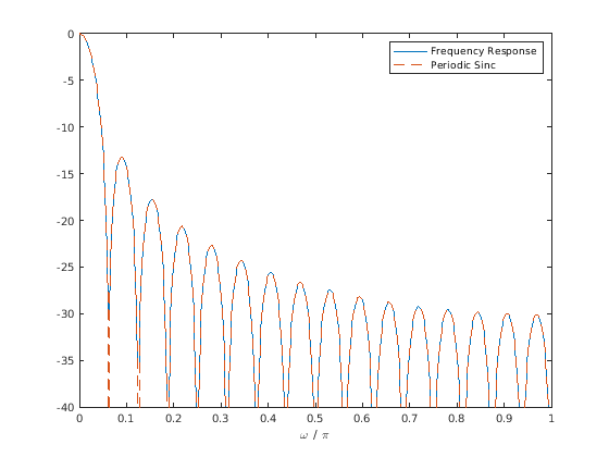 L = 32; [h,w] = freqz(rectwin(L)/L,1); y = diric(w,L); plot(w/pi,20*log10(abs(h))) hold on plot(w/pi,20*log10(abs(y)),'--') hold off ylim([-40,0]) legend('Frequency Response','Periodic Sinc') xlabel('\omega / \pi')