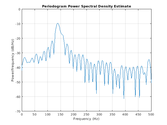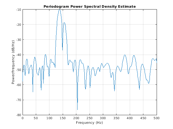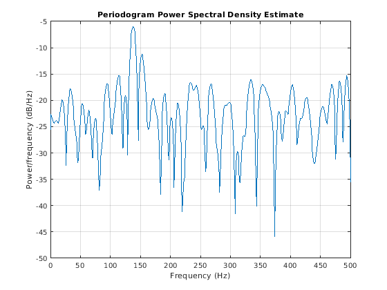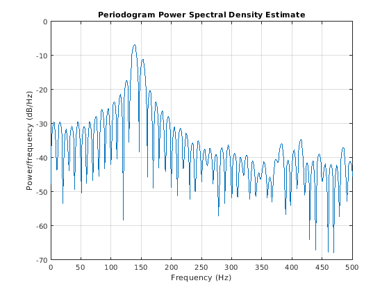 fs = 1000; % Sampling frequency t = (0:0.3*fs)/fs; % 301 samples A = [2 8]; % Sinusoid amplitudes (row vector) f = [150;140]; % Sinusoid frequencies (column vector) xn = A*sin(2*pi*f*t) + 5*randn(size(t)); periodogram(xn,rectwin(length(xn)),1024,fs)