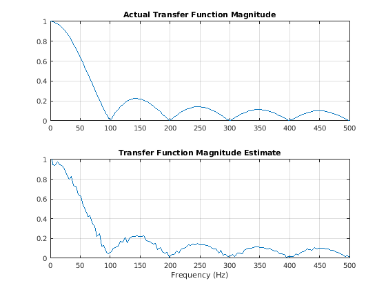 subplot(2,1,1) plot(f,abs(H)) title('Actual Transfer Function Magnitude') yl = ylim; grid subplot(2,1,2) plot(f,abs(HEST)) title('Transfer Function Magnitude Estimate') xlabel('Frequency (Hz)') ylim(yl) grid