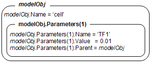 ' создает объект параметра, присваивает значение (NameValue', ValueValue)) к свойству NameValueName, присваивает значение (ValueValue) к свойству Value, и присваивает model object или kineticlaw object к свойству Parent. В или кинетическом объекте закона модели (Obj), этот метод присваивает объект параметра свойству Parameters, и возвращает объект параметра в переменную (parameterObj).