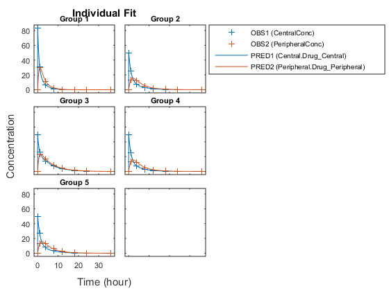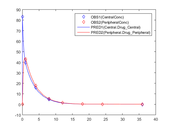 figure; plot(testData.Time,testData.CentralConc,'LineStyle','none','Marker','d','MarkerEdgeColor','b'); hold on plot(testData.Time,testData.PeripheralConc,'LineStyle','none','Marker','d','MarkerEdgeColor','r'); plot(ynew.Time,ynew.Data(:,1),'b'); plot(ynew.Time,ynew.Data(:,2),'r'); hold off legend({'OBS1(CentralConc)','OBS2(PeripheralConc)',... 'PRED1(Central.Drug\_Central)','PRED2(Peripheral.Drug\_Peripheral)'});