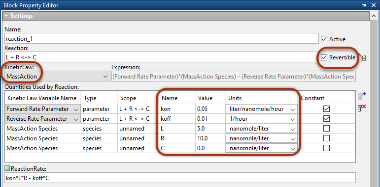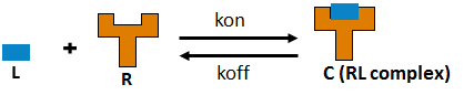 Используйте приложение SimBiology, чтобы создать модель, в которой лиганд L и лиганд приемника формы разновидностей R приемника объединяют посредством обратимых обязательных реакций. Эти реакции заданы с помощью кинетики действующих масс , где kon и koff вперед и инвертируют константы скорости. LR, и C концентрации лиганда, приемника и комплекса лиганда приемника соответственно.