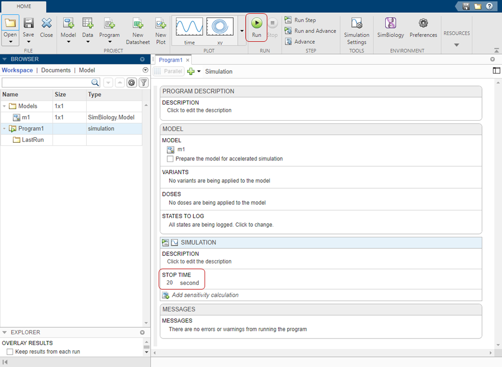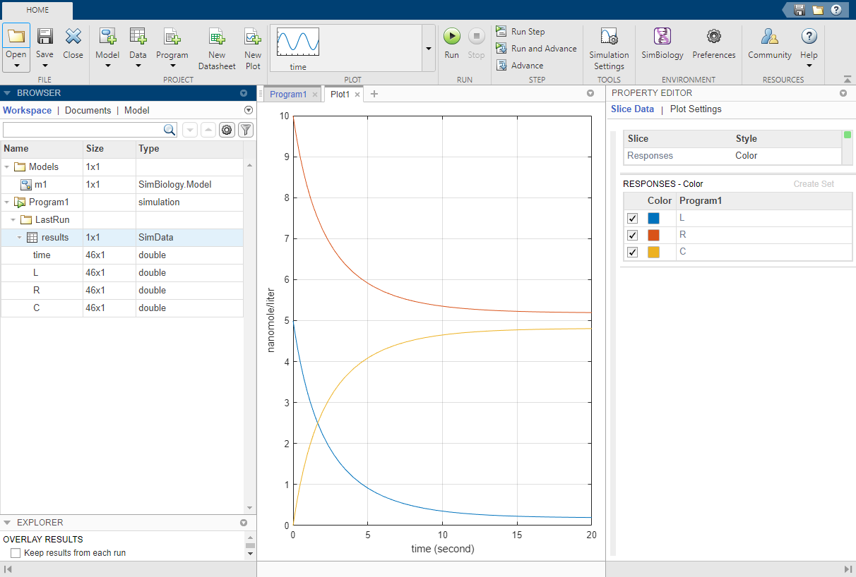 Чтобы симулировать эту реакцию, выберите Program > Simulate Model в разделе Project от вкладки Home. Установите Время остановки на 20 секунд на шаге Simulation, поскольку модель достигает влажного состояния после этого. Нажмите Run от вкладки Home.