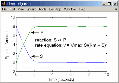 Следующий пример моделирует катализируемую ферментом реакцию с помощью кинетики Генри-Михаэлиса-Ментен с одной реакцией и уравнением скорости реакции. Введите реакцию, заданную ниже в программное обеспечение, и симулируйте.