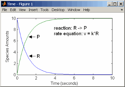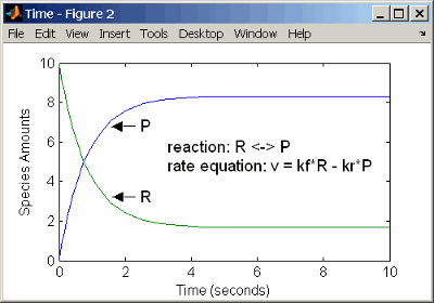 Ввод реакции выше в программное обеспечение и симуляцию приводит к следующим результатам. В равновесии, когда уровень прямой реакции равняется противоположной реакции, v = kf*R - kr*P = 0 и P/R = kf/kr.