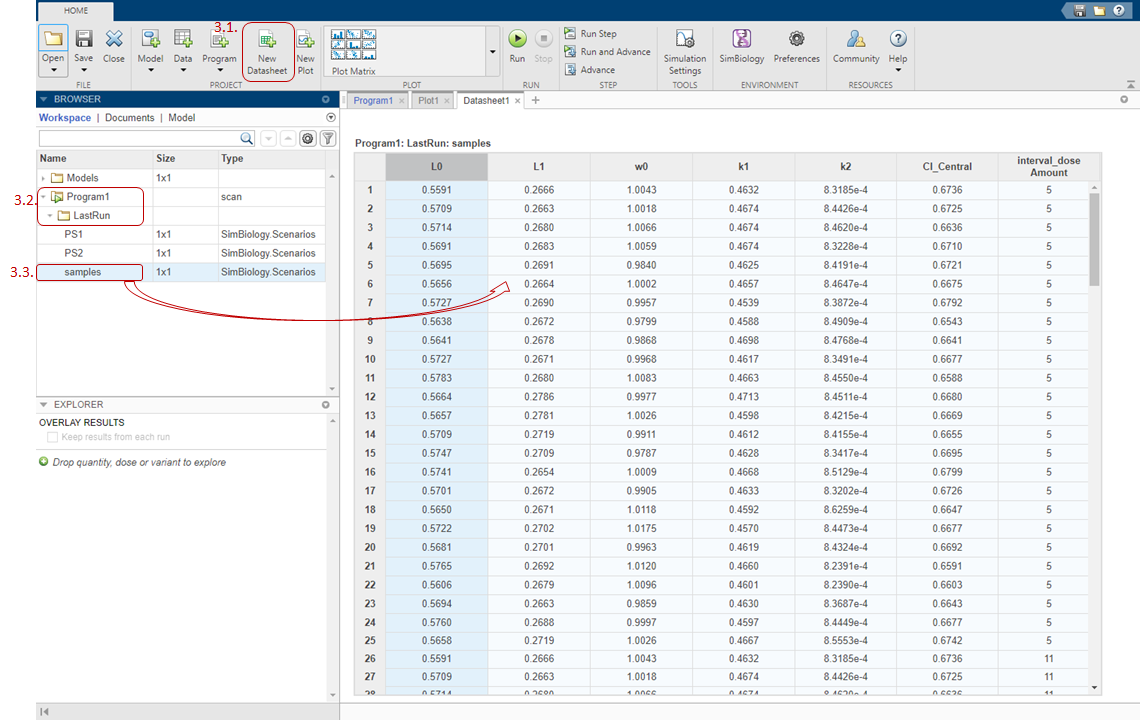 Отобразите сгенерированных виртуальных пациентов и комбинации дозы численно в табличном формате. На вкладке Home нажмите New Datasheet. От папки LastRun программы перетащите samples в новую таблицу данных. Каждая строка таблицы представляет сценарий симуляции с различными значениями параметра модели и суммами дозы.