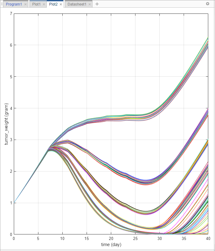В папке LastRun в панели Browser нажмите results. В разделе Plot по вкладке Home нажмите time. Каждая линия в графике представляет профиль веса опухоли каждого сценария симуляции.